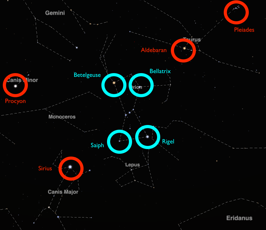 While there are a few other bright constellations in the winter sky of the Northern Hemisphere besides these ones, if you can identify this collection with Orion at the center, then you are off to an excellent start. And furthermore, by identifying Taurus and Gemini you can start to use them as references for other zodiac constellations that stretch to either side of them along the plane of the ecliptic.
